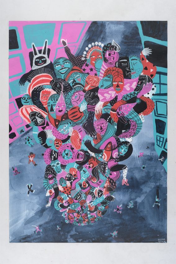 Entstanden ist ein komplexes Universum aus verspielten, phantasievollen, kritischen, witzig-bösen, frei assoziierenden, abstrakten, hintersinnigen und politischen Bildgeschichten auf hohem ästhetischen Niveau. Verschiedene Erfahrungen aus der gegenwärtigen Corona-Krise wurden ebenso verarbeitet wie Mietenwucher und Genderfragen. Neben überraschenden Wendungen und wundersamen Wandlungen tauchen Gedankenblitze, Implosionen und Selbstzerschlagungen auf.