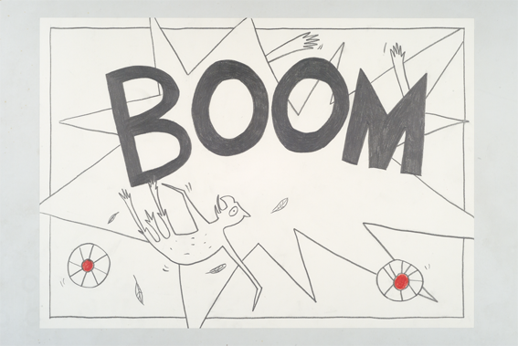 Für die Festivalausstellung zum Jahresthema BOOM! ließ sich der Kunstverein Neukölln zu einer Gruppenausstellung mit Bildergeschichten rund um den großen Knall inspirieren. 14 Künstler*innen wurden eingeladen, große und kleine Explosionen im gesellschaftlichen und privaten Leben zu reflektieren und offen in alle Richtungen zu interpretieren. Gedanklicher Ausgangspunkt waren die Bildwelten und formalen Besonderheiten des Comics, doch ging es nicht ausschließlich darum, dessen Zeichenstil aufzugreifen. Vielmehr konnte eine narrative Struktur in 3 bis 5 Bildern genutzt werden, um eine BOOM! Story mit eigenen bildnerischen Mitteln zu schaffen.